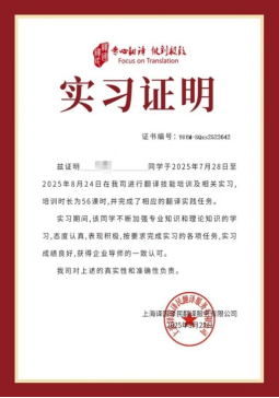 为帮助在校生提升英语实用能力,适应AI赋能语言能力的行业发展趋势, 2025 年暑期,太阳集团tyc33455官网联合全球五十强语言服务企业——译国译民集团,组织各专业在校生 300余人参加了“编译世界的算法”主题在线实习。项目围绕“AI工具应用、翻译技能以及 行业认知设计课程。内容涵盖外刊精读、基础翻译技巧、译后编辑(MTPE)以及DeepSeek 等工具实践,突出工程语境下的技术文档处理与跨文化沟通。实习按“每日学习+直播回放+社群答疑”灵活组织,兼顾暑期节奏与学习效果。截至实习结束,217 名同学达到合格标准,获得平台出具的实习证明与语言能力成长记录。